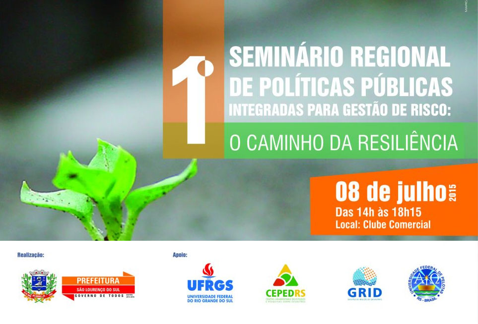 Na tarde de quarta-feira (08), São Lourenço do Sul sedia a realização de um seminário regional que abordará o tema “Políticas públicas integradas para a gestão de risco: o caminho da resiliência”. O evento, direcionado a gestores públicos, técnicos das prefeituras, agentes de defesa civil, comunidade acadêmica e a população em geral, será realizado a partir das 14 horas, no Clube Comercial.