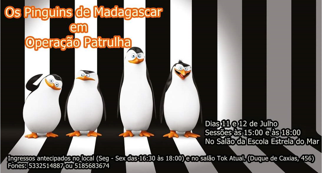 A Cia. Teatral Misenscene apresenta o espetáculo infantojuvenil, Pinguins de Madagascar, em Operação Patrulha, no sábado (11) e domingo (12), sábado e domingo, sempre em duas sessões, às 15 horas e às 18 horas, no salão da Escola Estrela do Mar.