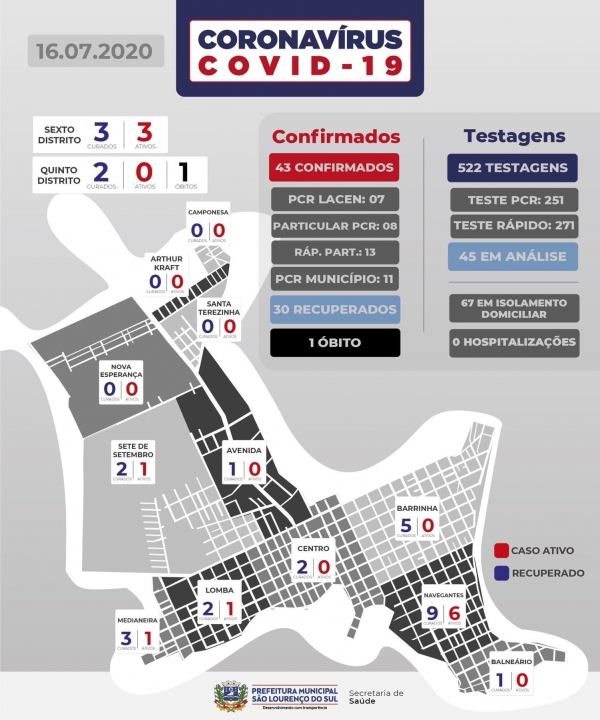 São Lourenço do Sul registra dois novos casos de COVID-19 nesta quinta-feira (16). Uma mulher de 34 anos moradora do bairro Medianeira que realizou o teste PCR da rede municipal e um homem de 36 anos do bairro Navegantes que realizou o teste PCR da rede municipal. Ambos estão em isolamento domiciliar.