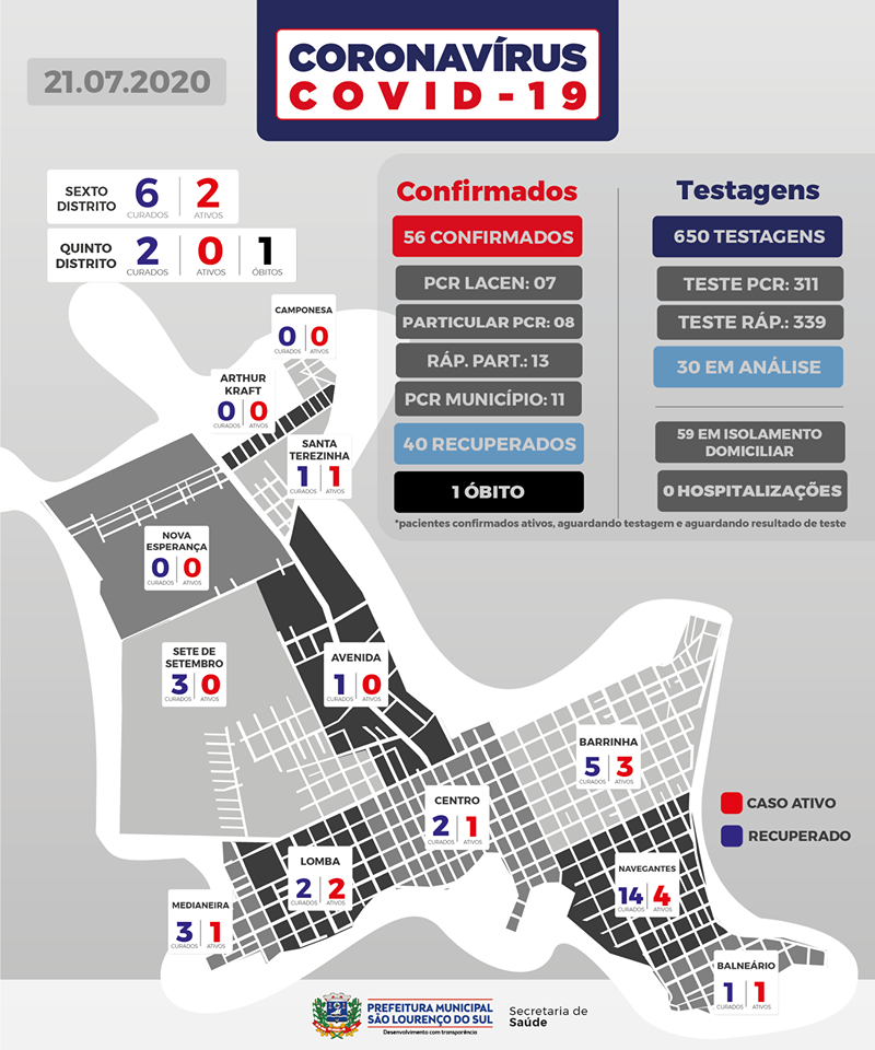 São Lourenço do Sul registra três novos casos nesta terça-feira (21). Uma menina de nove anos do bairro Barrinha, uma mulher de 20 anos do bairro Centro e um homem de 21 anos do Balneário testaram positivo para COVID-19 e estão com o vírus ativo.