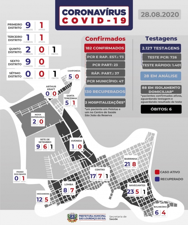 São Lourenço do Sul tem 13 novos casos de COVID-19 confirmados nesta sexta-feira (28), todos com o vírus ativo: trata-se de homem de 32 anos da Sete de Setembro que fez teste rápido; e os demais que fizeram teste PCR: mulher de 35 anos do Navegantes; homem de 58 anos da Sete de Setembro; homem de 41 anos do Balneário; menina de 7 anos do Balneário; mulher de 51 anos do 1º Distrito (Espinilho); mulher de 62 anos da Lomba; mulher de 63 anos da Barrinha; mulher de 53 anos da Barrinha; homem de 50 anos da Barrinha; mulher de 65 anos do Navegantes; mulher de 75 anos da Lomba; e mulher de 75 anos da Sete de Setembro.