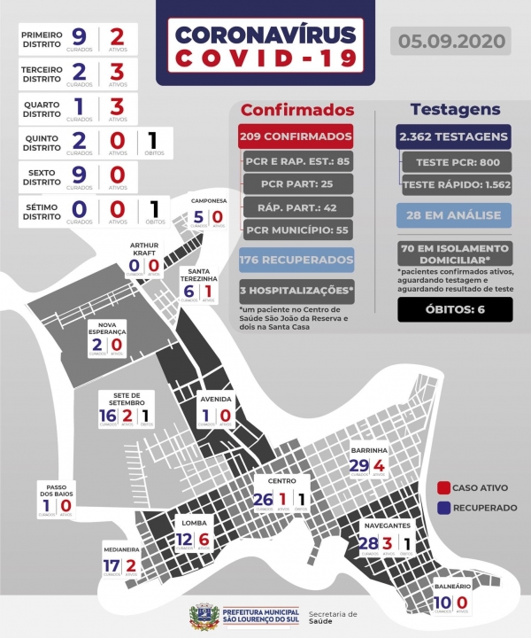 São Lourenço do Sul tem um novo caso de COVID-19 confirmado neste sábado (5), de uma paciente de 87 anos do 3º Distrito (Socorro) que fez o teste rápido e está com vírus inativo, portanto, já recuperada.