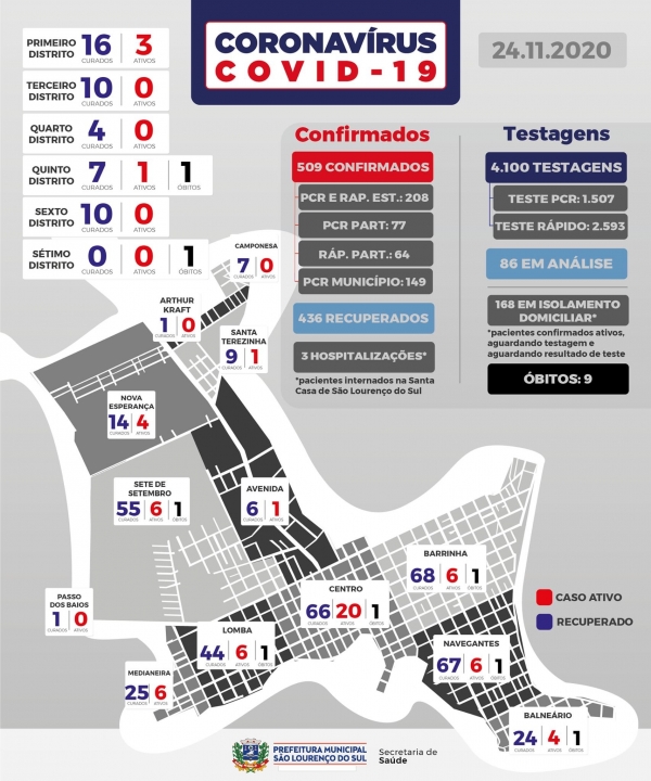 São Lourenço do Sul registra oito novos casos de COVID-19 nesta terça-feira (23): mulher de 29 anos do Balneário, homem de 69 anos da Avenida, mulher de 67 anos da Barrinha, menina de 11 meses do Centro, menino de 5 anos do Boqueirão, homem de 33 anos da Barrinha, moça de 15 anos da Nova Esperança e homem de 21 anos da Lomba. Todos estão com o vírus ativo.