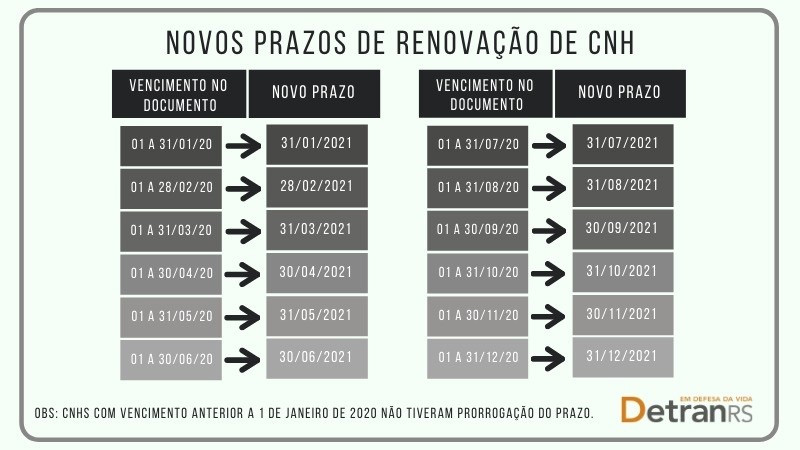O restabelecimento dos prazos para renovação da CNH vale para todos os condutores que tiveram habilitação vencida em 2020. A partir 1º de janeiro de 2021, a contagem do prazo será retomada, com o acréscimo de um ano do mês de vencimento que consta no documento. Ou seja, CNHs com data de validade de janeiro de 2020 poderão renovar até 31 de janeiro de 2021; para as vencidas em fevereiro de 2020, a renovação poderá ocorrer até 28 de fevereiro de 2021; e assim sucessivamente, até 31 de dezembro de 2021 para as habilitações com validade em dezembro de 2020.