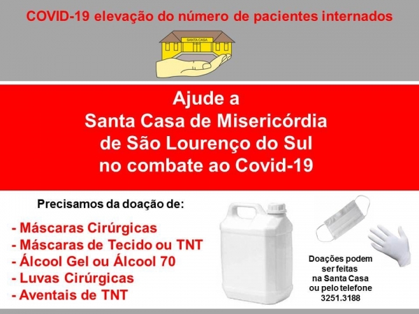 A Santa Casa de São Lourenço do Sul divulgou em sua rede social um pedido de ajuda para doações de material de proteção contra a Covid-19 em razão do aumento dos casos no município. São bem vindas as doações de máscaras cirúrgicas, máscaras de tecido TNT, alcool Gel ou alcool 70, luvas cirúrgicas e aventais TNT.