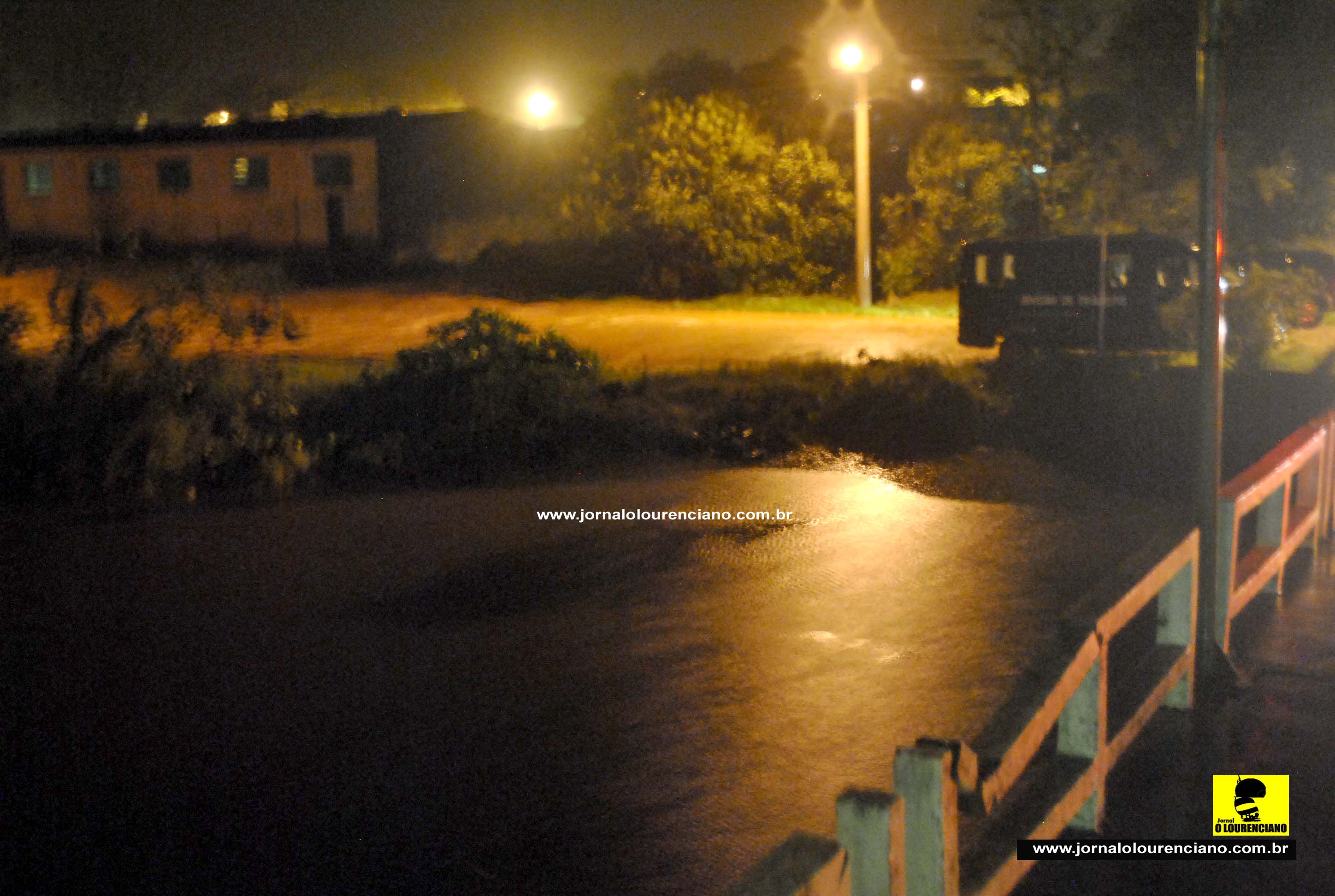 Às 23:50h deste sábado o nível do Arroio São Lourenço estava um pouco acima do normal nas proximidades da ponte que leva ao Camping municipal (como mostra na foto). Em alguns pontos mais baixos, como na Av. São Lourenço quase esquina Max Stenzel a água quase avança sobre a rua, assim como na curva da Av. São Lourenço próximo a rua Humaitá. A Defesa Civil continua monitorando as águas para mais informações