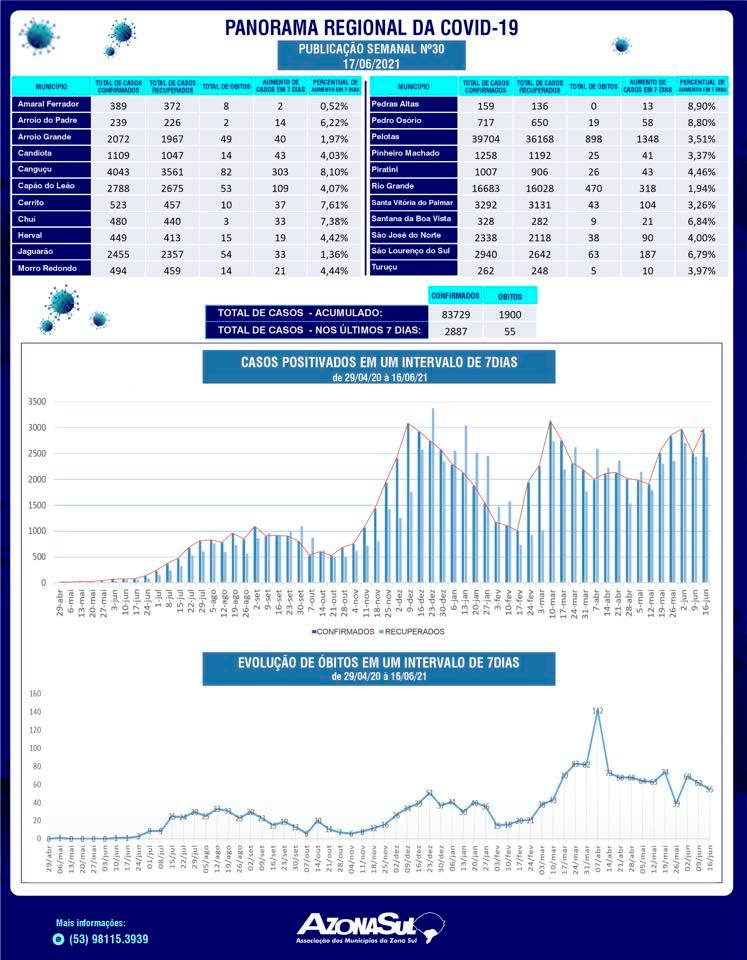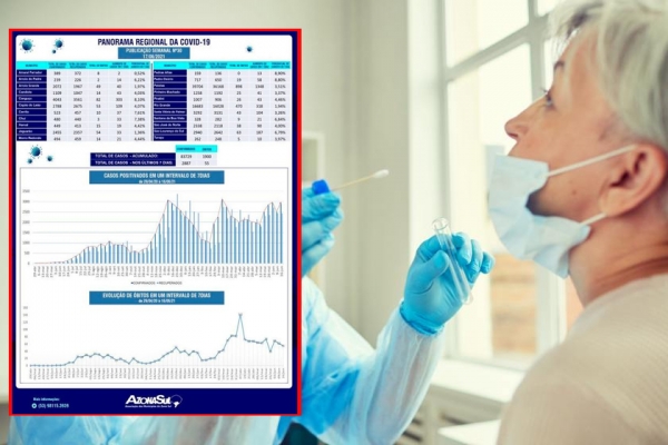 Conforme o Panorama semanal do covid-19, realizado pela AZONASUL (Associação dos Municípios da Zona Sul), a região segue em alerta, contabilizando 2.887 novos casos nos últimos 7 dias.