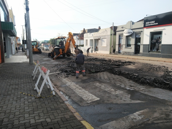 Empresa Construtora Pelotense, contratada para asfaltamento da Avenida Marechal Floriano Peixoto trabalhou no dia de ontem, quinta-feira (feriado), na retirada dos resíduos de asfalto antigo que estava danificado para ser possível a aplicação das camadas do material novo entre as ruas Pinheiro Machado e Almirante Abreu.
