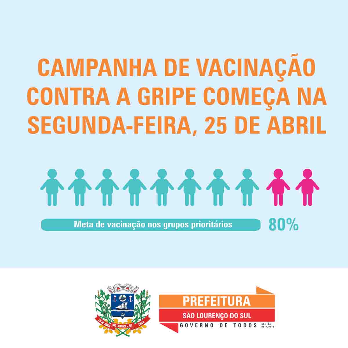 A Campanha Nacional de Vacinação contra o vírus da Influenza começa nesta segunda-feira (25) em São Lourenço do Sul. As vacinações acontecem em todas as Unidades Básicas de Saúde (UBS), das 08h às 12h e das 13h às 17 na zona urbana e no interior das 13h às 16h. Para realizar a vacina é necessário portar a Caderneta de Vacinação ou prescrição médica com CID e receita médica para portadores de doença crônica.