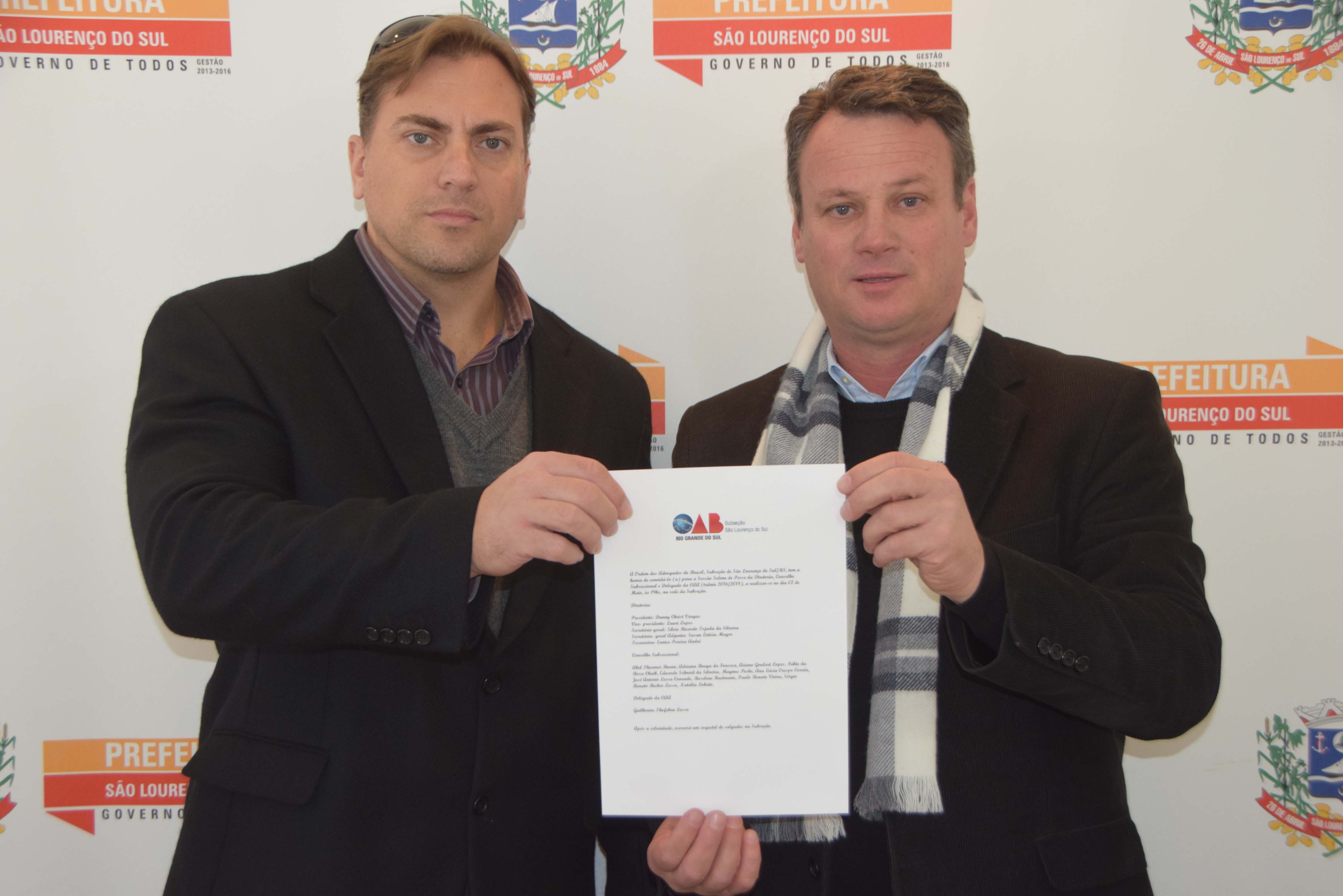 O prefeito Daniel Raupp recebeu na tarde de sexta-feira (29) a visita do novo presidente da Ordem dos Advogados do Brasil (OAB), Subseção São Lourenço do Sul, Danny Christ Vargas. Na ocasião, Vargas entregou ao chefe do executivo o convite para a sessão solene de posse da Diretoria, Conselho Subseccional e Delegado da Caixa de Assistência dos Advogados do Rio Grande do Sul (CAA/RS), que será realizada na noite de segunda-feira (02), a partir das 19 horas, na sede da Subseção.