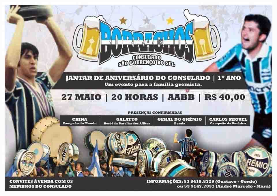Às 20h do próximo dia 27 de Maio, uma noite que vai marcar a história da Torcida Gremista em São Lourenço do Sul. Vem aí o Jantar de Um Ano do Consulado Gremista de São Lourenço do Sul, na AABB. Presenças confirmadas: