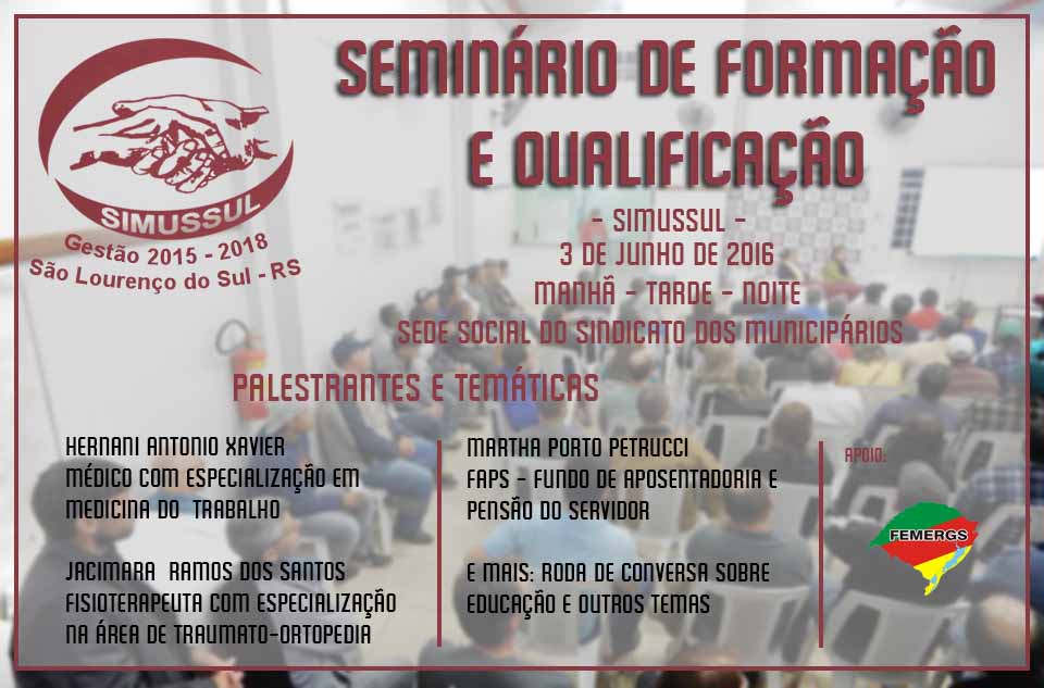 O Sindicato dos Municipários de São Lourenço do Sul (Simussul) irá realizar no dia 3 de junho de 2016 mais um Seminário de Formação e Qualificação para os servidores municipais. O evento acontece durante os três turnos, possibilitando a participação de todos.