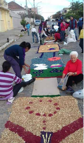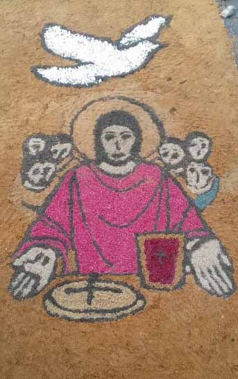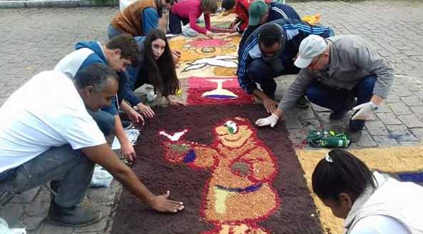 Na manhã desta quinta-feira (26) Fiéis confeccionaram tapetes artísticos para a procissão de Corpus Christi em frente a Igreja Matriz.