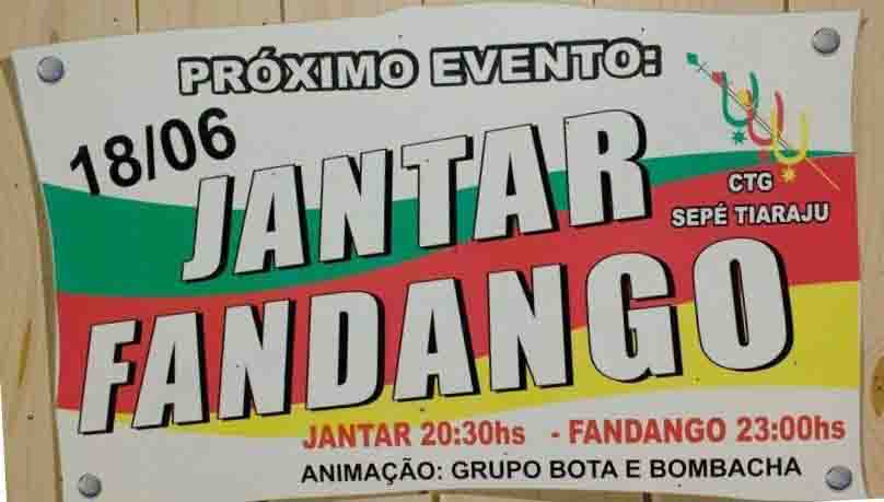 A patronagem do CTG Sepé Tiaraju convida a todos para o jantar-fandango neste sábado 18 de junho de 2016,animação do Grupo Bota e Bombacha.