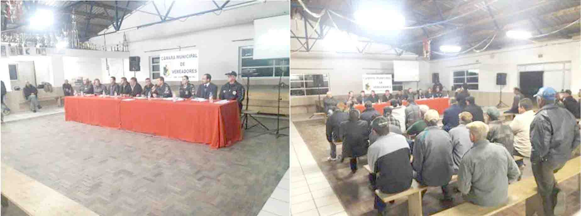 * Na noite da última sexta-feira (24), às 19 h, numa proposição do vereador Luis Clairton Belling Weber, foi realizada uma audiência sobre Segurança Pública no interior do município, na comunidade São Paulo, na localidade de Quevedos, 6º Distrito de São Lourenço do Sul, proposta pela Câmara Municipal. O objetivo foi debater e buscar soluções para tratar dos problemas de segurança pública, principalmente na zona rural do nosso município. A mesa de debate foi formada pelas seguintes autoridades: Major Marcelo Nunes Ferreira, Cmte. do 30º BPM, Capitã Pâmela Mühlemberg Tavares Saueressig, Cmte. da 2ª Cia/30ºBPM, Delegado de Polícia Edson Vinicius Ramalho, titular da DP São Lourenço do Sul, chefe de investigação da DP de São Lourenço do Sul, inspetor Celso Ferreira Almeida, Enio Ritter, Presidente do Conselho Municipal de Segurança Pública, Valnei Gustavo Rojahn Brose, Presidente do Sindicados dos Trabalhadores Rurais de São Lourenço do Sul, vereadores Luis Clairton Belling Weber, Dari Pagel, Nestor Mario Karnopp e Paulo Sergio Silva Pereira (Presidente da Câmara Municipal).