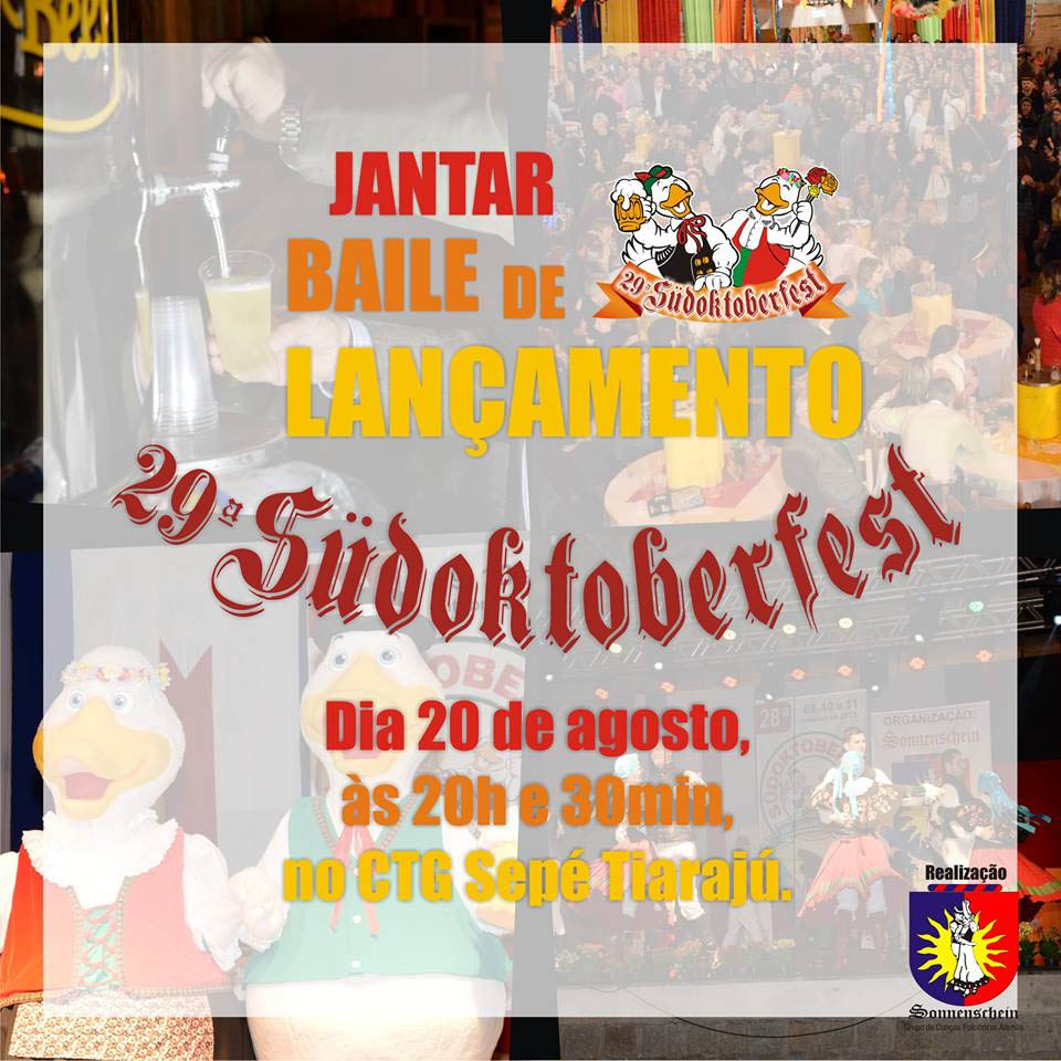 Dia 20 de agosto, acontecerá o Lançamento da 29ª Südoktoberfest, a partir das 20h e 30min, no CTG Sepé Tiarajú. Será uma prévia do que nos espera na Oktoberfest do Sul em 2016: Jantar típico alemão/pomerano, apresentações do G.D.F.A. Sonnenschein, baile com a Banda SUL BRASS, presença da corte e dos mascotes da Festa, apresentação da programação completa da 29ª edição da Maior Festa Germânica da Região!