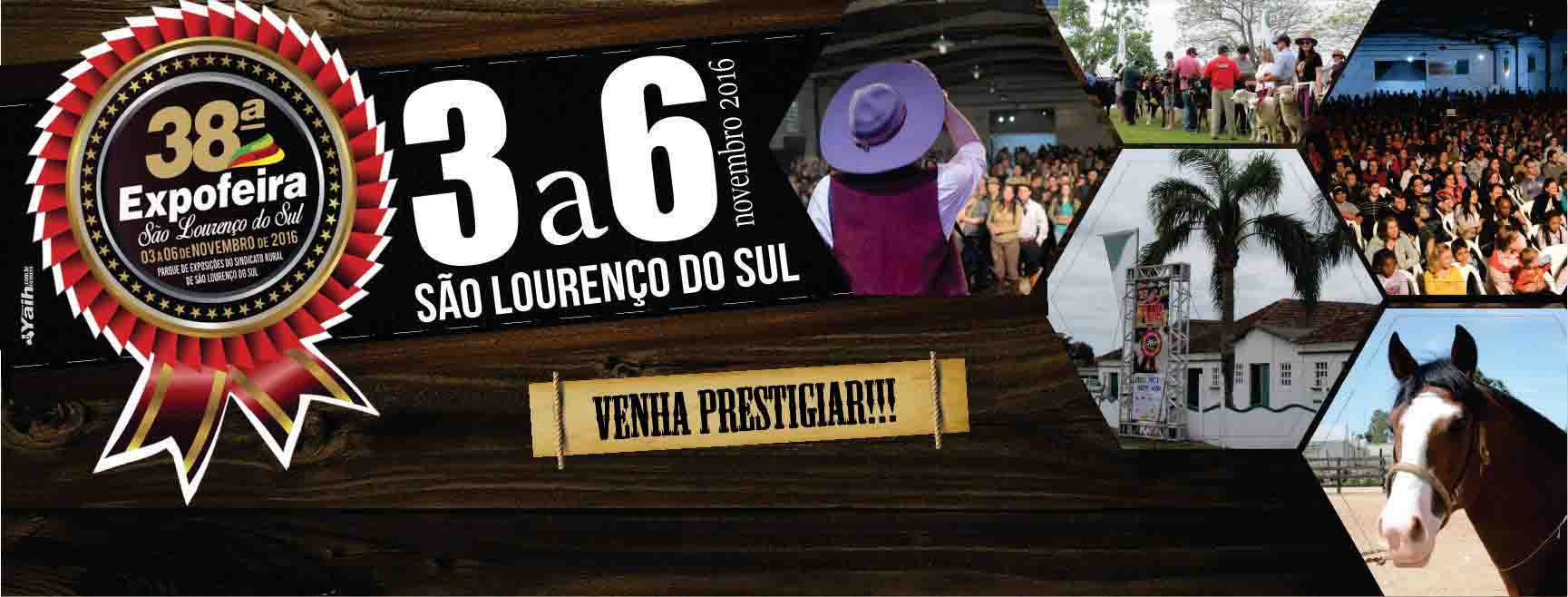 A 38ª Expofeira é uma realização do Sindicato Rural de São Lourenço do Sul tendo o Sindicato dos Trabalhadores Rurais e da Associação Comercial e Industrial de São Lourenço do Sul (ACI/CDL), tendo a produção de X13 Produções.