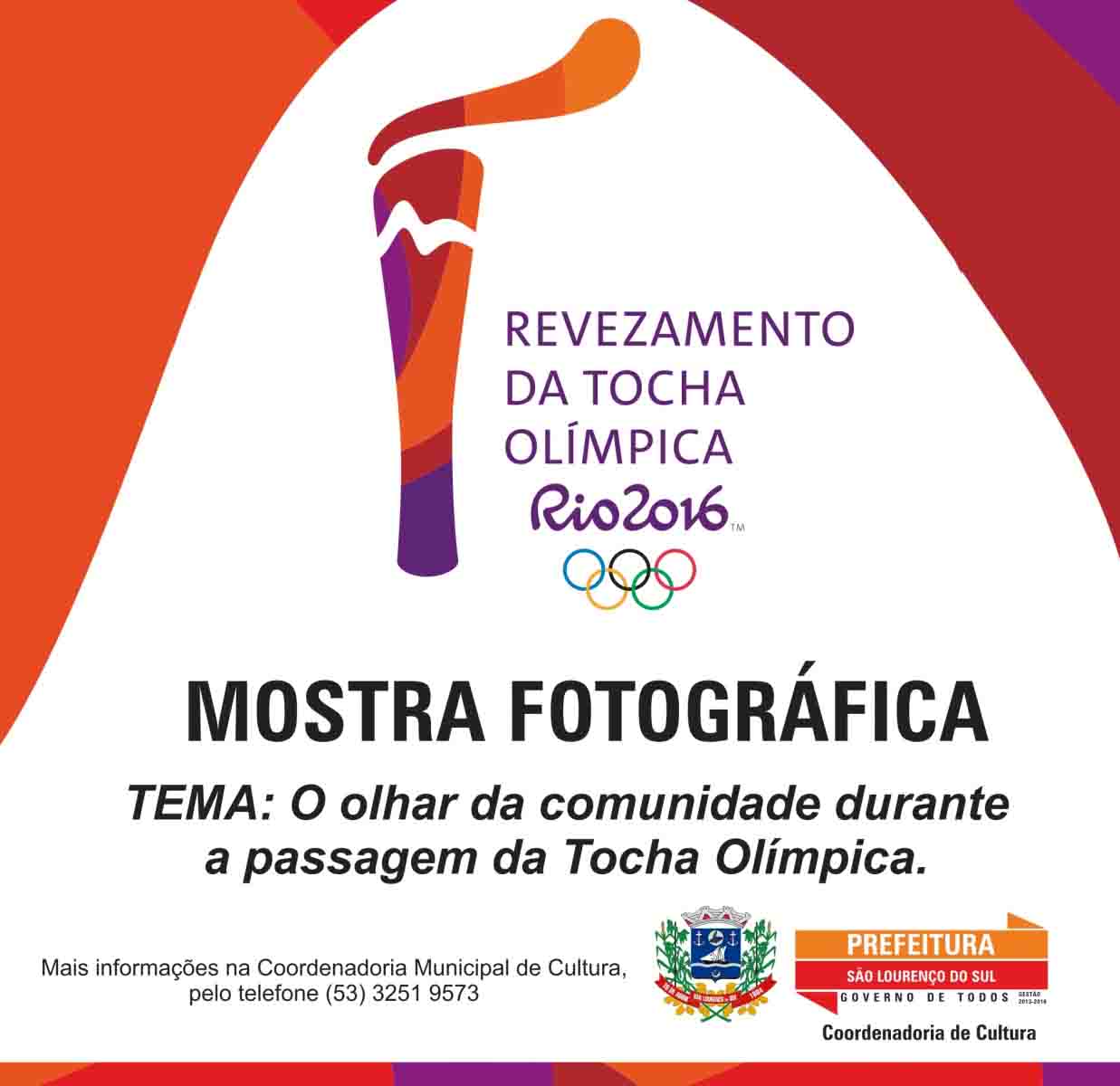* O olhar da comunidade lourenciana durante a passagem da tocha olímpica em São Lourenço do Sul é o tema da mostra fotográfica promovida pela Prefeitura, através da Coordenadoria Municipal de Cultura, para manter o registro histórico do evento que aconteceu no mês de julho. As inscrições podem ser realizadas até o dia 31 de outubro, podendo ser enviadas para o e-mail Este endereço de email está sendo protegido de spambots. Você precisa do JavaScript ativado para vê-lo. - Coordenadoria Municipal de Cultura. A mostra acontece nas categorias infantil (até doze anos), livre e profissional. As fotografias precisam ser inéditas, sem a divulgação em redes sociais ou veículos de comunicação. Não há limite de fotografias para a participação. As imagens devem estar ampliadas no formato 30x40 cm em papel com gramatura 230 fosco ou brilhante, não sendo necessária a revelação em papel fotográfico, além de um CD ou CD-ROM, contendo a imagem em JPEG, com resolução em 300 dpi. No verso da fotografia é necessário colocar uma etiqueta com as seguintes informações: número de inscrição; nome do autor; RG e um resumo de três linhas da história de cada imagem. Fotografias com representação de pessoas precisam conter uma autorização de imagem, que devem ser enviadas por Sedex para o seguinte endereço: Rua XV de Novembro, 302 - Centro; CEP 96170-000. Dúvidas podem ser esclarecidas através do e-mail Este endereço de email está sendo protegido de spambots. Você precisa do JavaScript ativado para vê-lo.. (Decom)