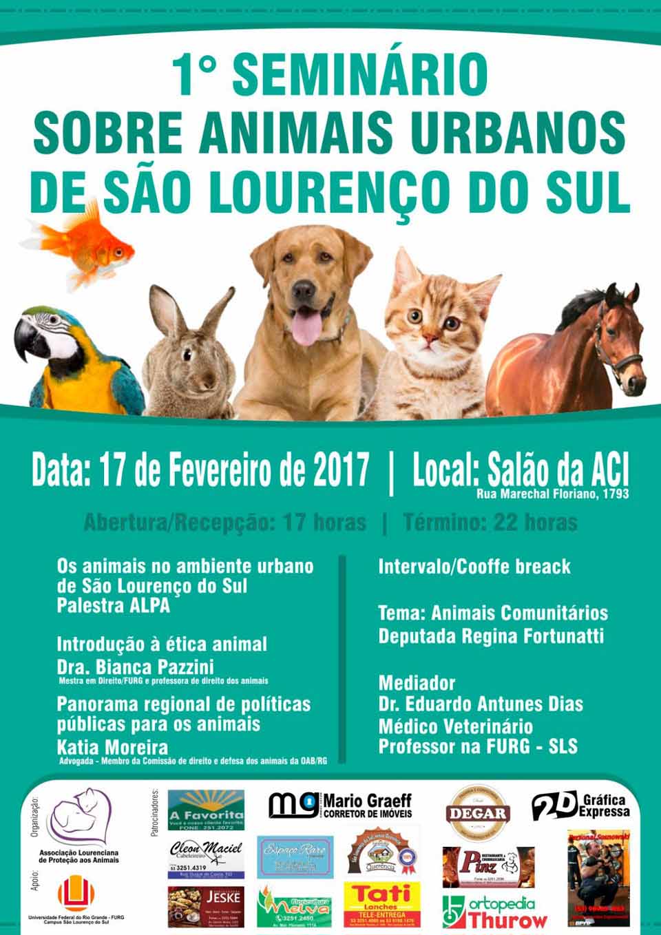 O campus São Lourenço do Sul (SLS) da Universidade Federal do Rio Grande (FURG) convida a comunidade universitária para o 1º Seminário sobre os Animais Urbanos de São Lourenço do Sul. O evento será realizado na próxima sexta-feira (17), às 17h, na Associação Comercial e Industrial (ACI) do município. O seminário é aberto à comunidade. Serão abordados temas como animais comunitários, ética animal, política públicas e a situação dos animais de rua de São Lourenço do Sul.