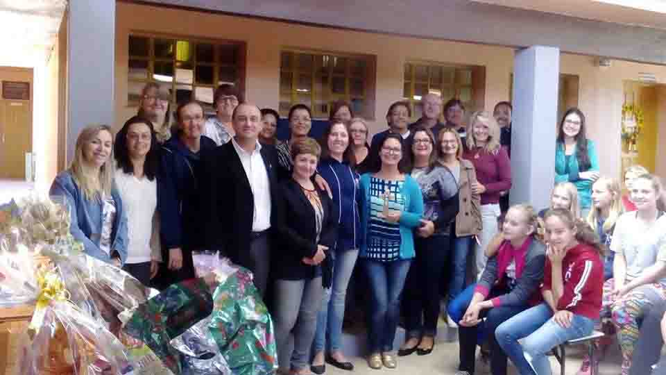 "A turma hoje do 6º ano, há dois anos atrás, juntamente com as professoras Nair Lüdtke e Patrícia Patzlaff, fizeram doação de lacres de latinhas para o Rotary de Pelotas e no dia 13 de abril, deste ano, veio a recompensa: doação de uma cadeira de rodas para o Posto de Saúde da nossa localidade, Harmonia, entrega feita pelas senhoras do Rotary Clube de Pelotas."