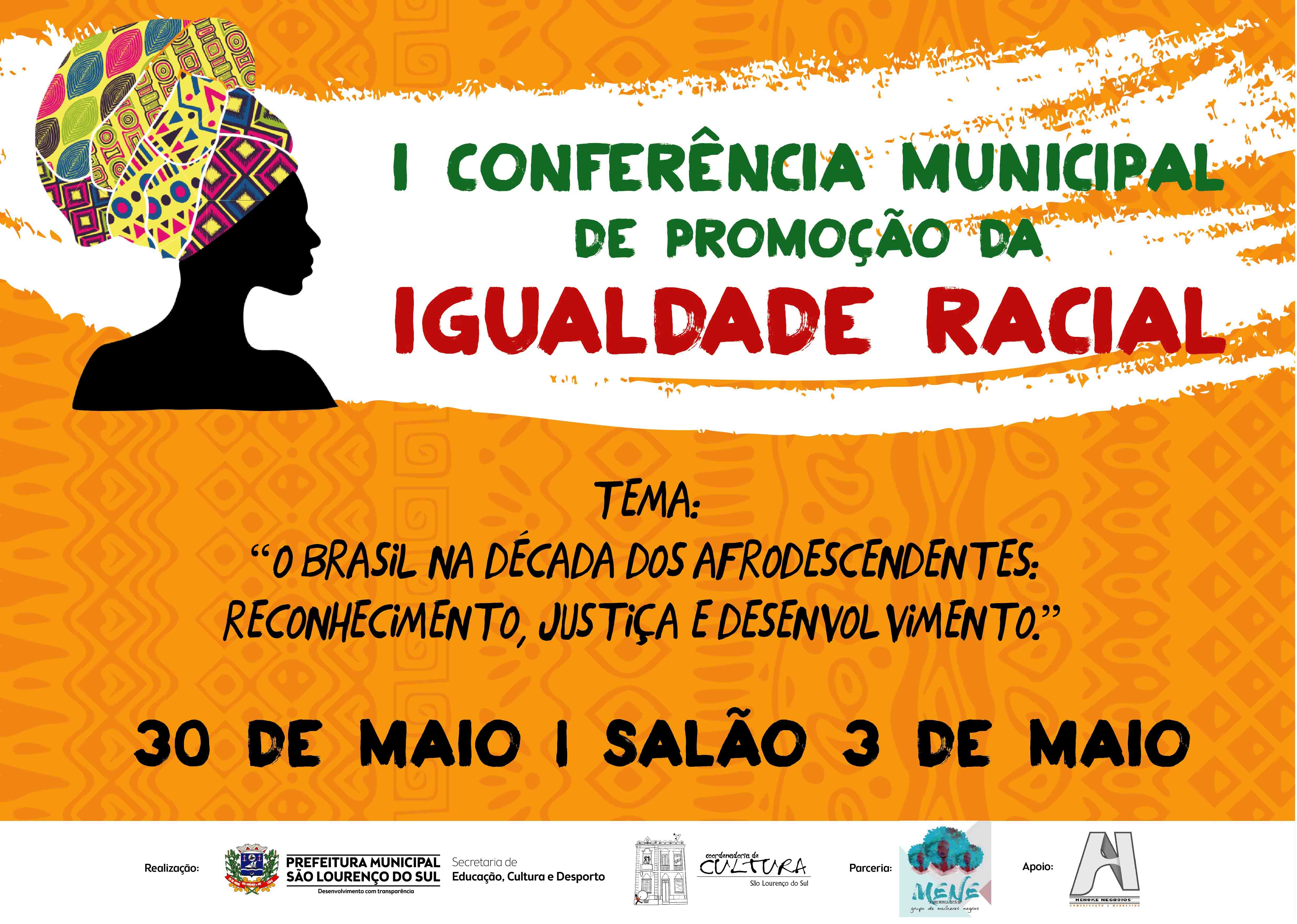 A 1ª Conferência Municipal de Promoção da Igualdade Racial, com o tema: “O Brasil na década dos Afrodescendentes: reconhecimento, justiça e desenvolvimento”, será realizada no dia 30 de maio no Salão Três de Maio, iniciando às 9hrs e com termino previsto para 17h. A realização é da Prefeitura Municipal através da Coordenadoria de Cultura em parceria com Mene - Grupo de Mulheres Negras, Associação de Capoeira Filhos da Roda e APNS (Agente da Pastoral dos Negros) e com apoio de Hencke Negócios. Confira a programação: 8h: Credenciamento 9h: Abertura do evento 9h30: Apresentação artística 10h: Apresentação dos eixos temáticos 11h30: Intervalo do almoço 15h30: Escolha dos delegados 16h: Orientações sobre os próximos passos 16h30: Apresentação artística 17h: Encerramento da conferência
