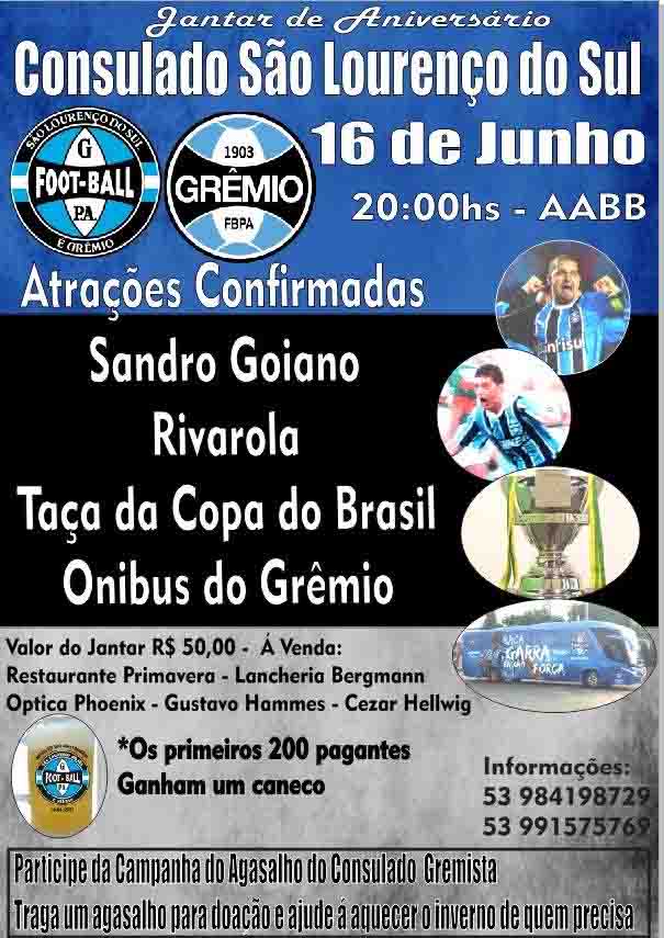 Nesta sexta(16) acontece o jantar de aniversário do consulado Gremista de São Lourenço. Serão mais de 400 gremistas celebrando uma grande noite.