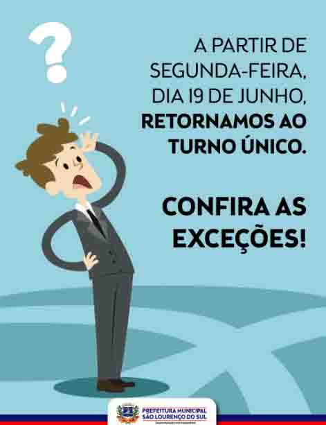 Art. 2º Fica instituído turno único contínuo de 06 (seis) horas diárias no Serviço Público Municipal, das 08:00 às 14:00, com um intervalo de 15 (quinze) minutos aos servidores, para repouso e alimentação, a partir do dia 19 de junho de 2017, com as seguintes exceções: