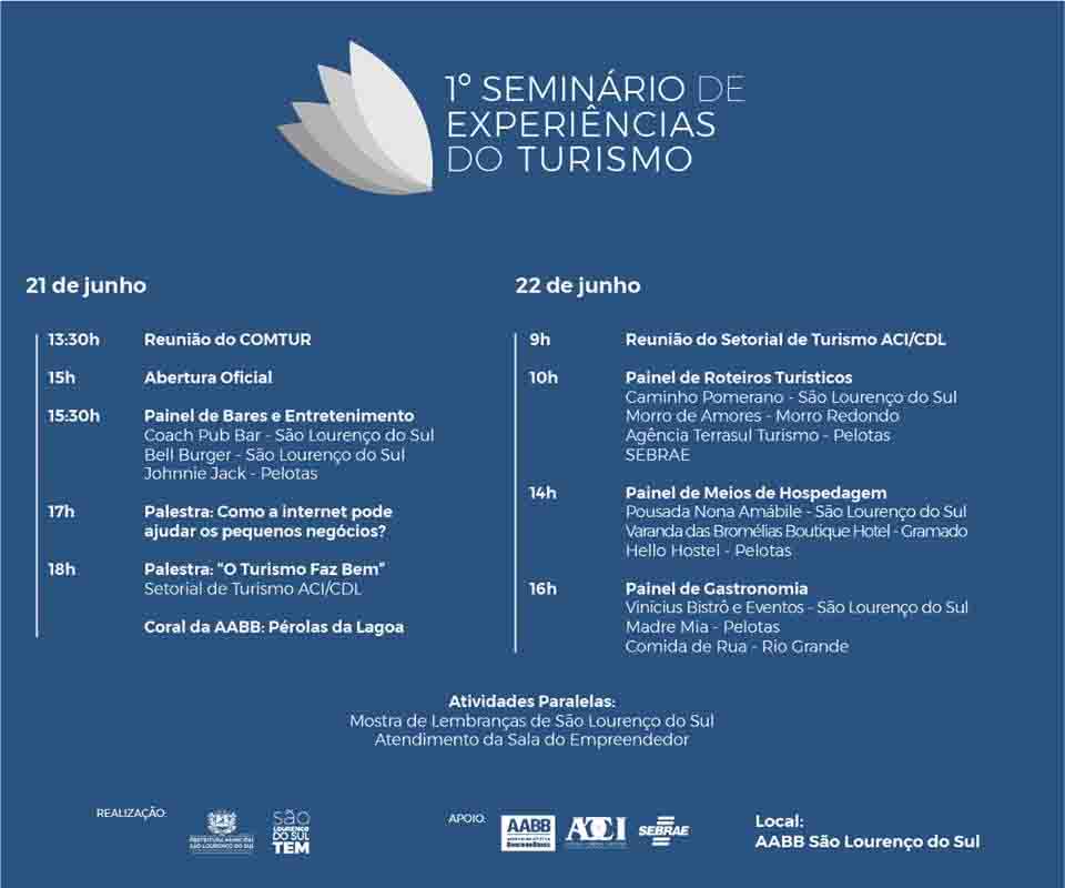 O 1º Seminário de Experiências do Turismo é uma realização da Prefeitura Municipal de São Lourenço do Sul através da Secretaria Municipal de Turismo, Indústria e Comércio com o apoio da AABB São Lourenço do Sul, Associação Comercial e Industrial de São Lourenço do Sul e Sebrae.