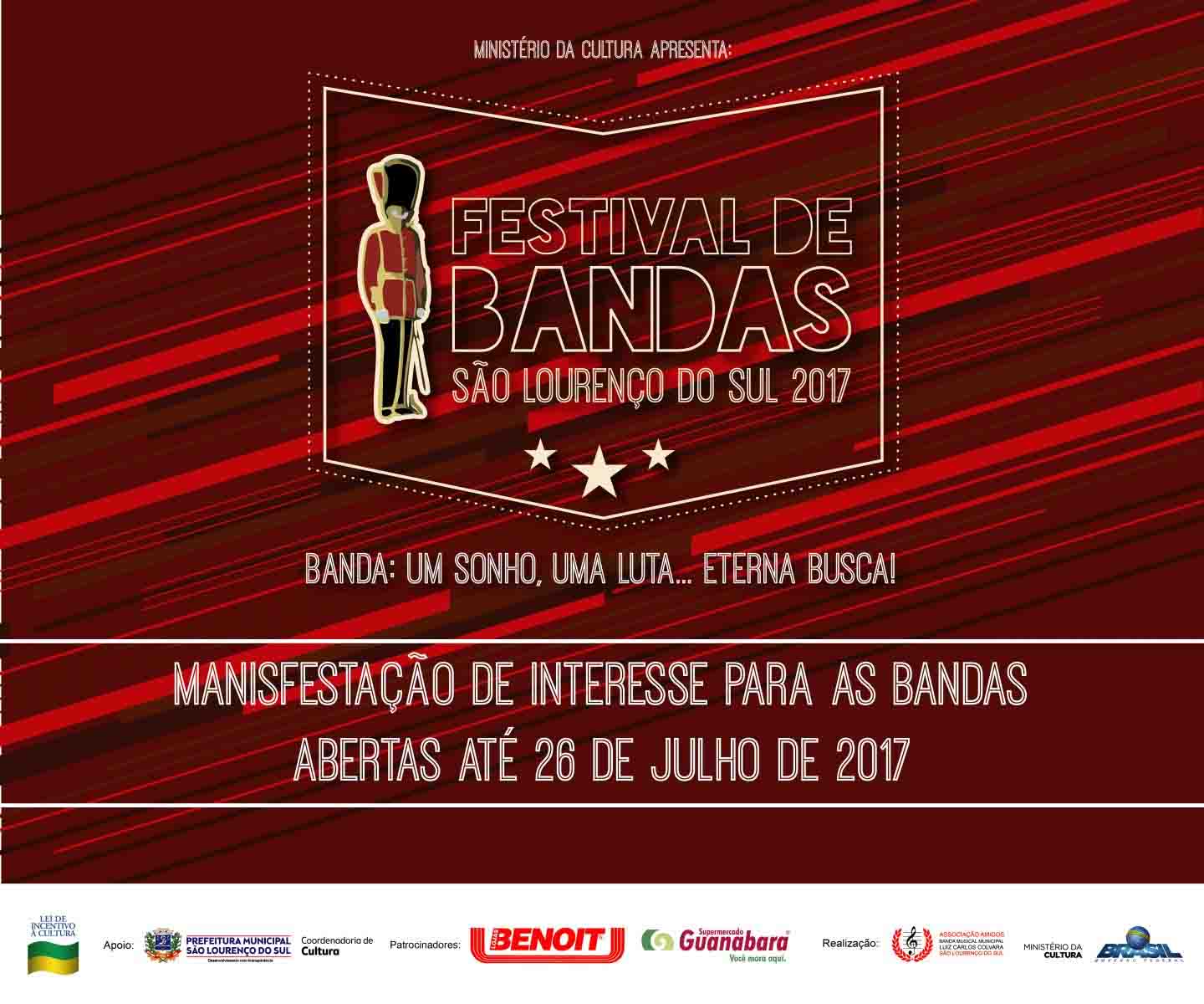 As manisfestações de interesse em participar do Festival de Bandas de São Lourenço do Sul de 2017 estão abertas até o dia 26 de julho, através do e-mail: Este endereço de email está sendo protegido de spambots. Você precisa do JavaScript ativado para vê-lo., com o preenchimento e envio da ficha de MANIFESTAÇÃO DE INTERESSE.