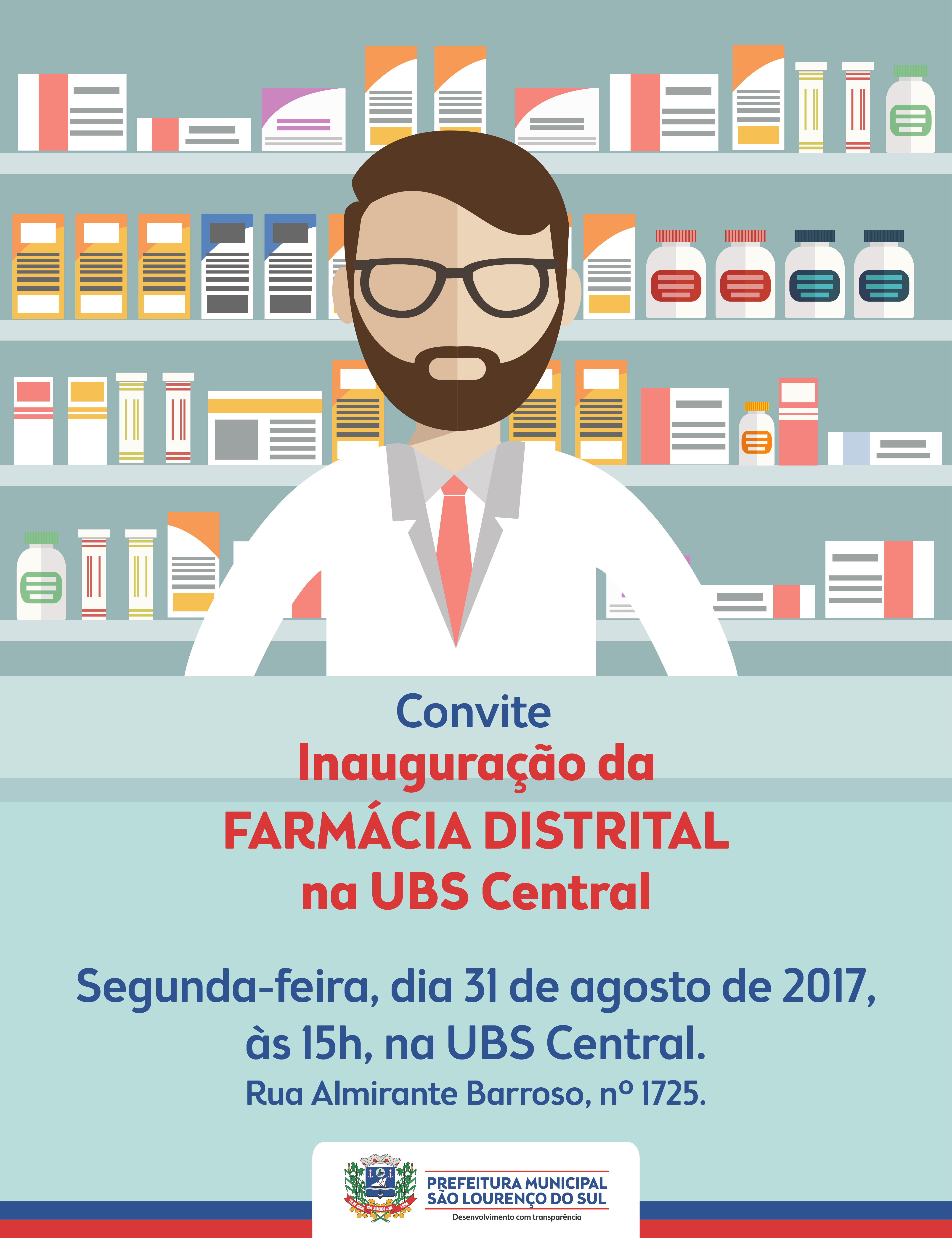 A Prefeitura Municipal de São Lourenço do Sul, através da Secretaria de Saúde, convida a comunidade em geral, autoridades e servidores para a cerimônia de inauguração da FARMÁCIA DISTRITAL da UBS Central, no dia 31 de julho de 2017, às 15h, na UBS Central, situado à rua Almirante Barroso nº 1725.