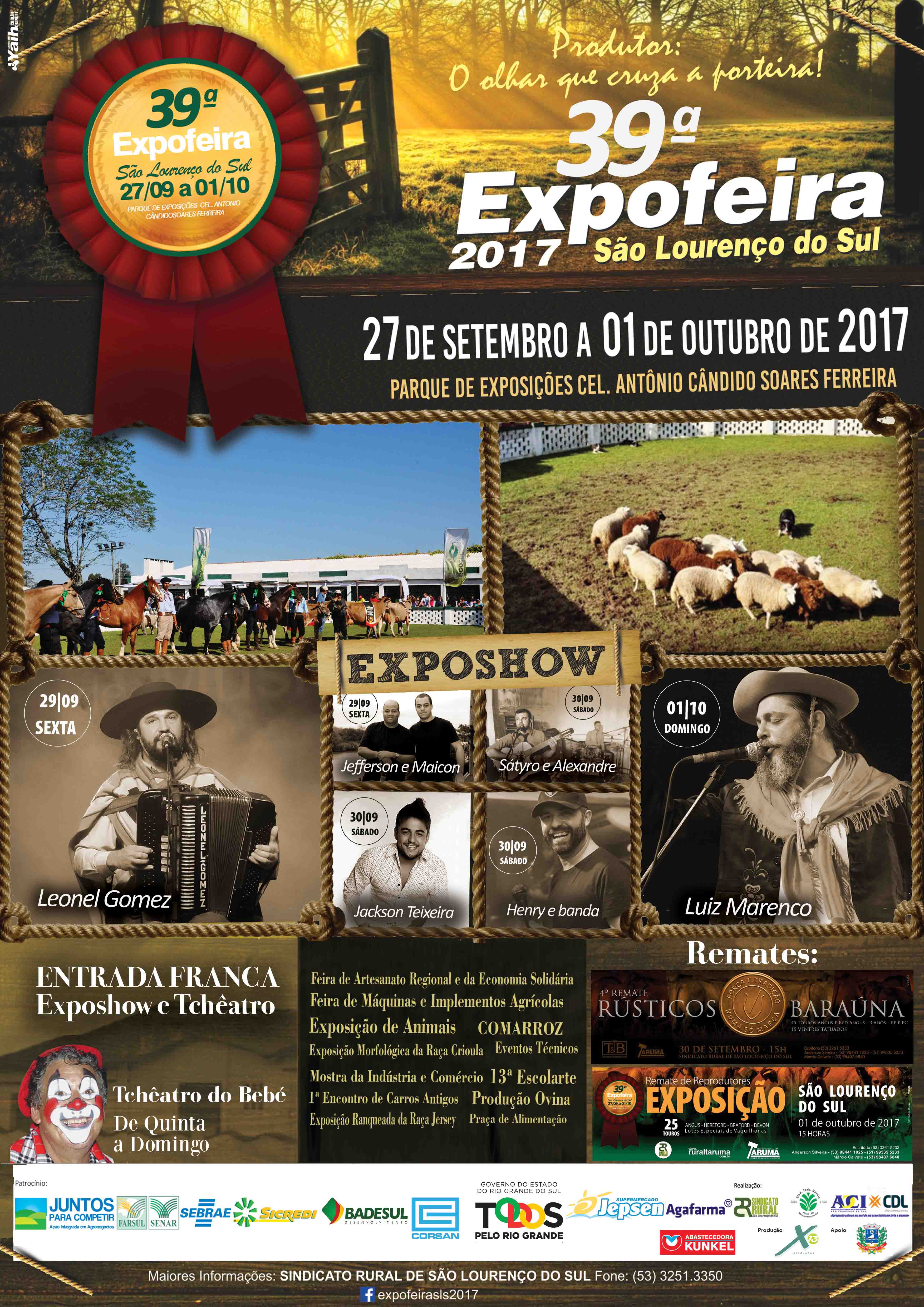A 39ª Expofeira de São Lourenço do Sul acontece de 27 de setembro a 1º de outubro de 2017, no Parque de Exposições do Sindicato Rural. Os temas das palestras estão confirmados e certamente vão abordar técnicas que visam aprimorar o conhecimento do homem do campo. Na segunda-feira, 25 de setembro, a Afecctum Consultoria fala sobre o tema, “Planejamento da Sucessão” – Palestrante, Ricardo Paz Gonçalves. Na terça-feira, 26 de setembro, a realização da palestra aborda o “Controle de Doenças Reprodutivas e seu Impacto na Produção de Terneiros”, com o Med. Vet. Renato Zucco, sob a responsabilidade da Veterinária Salaberry. No dia 27 de setembro, quarta-feira, a Seapa traz o palestrante José Reck Junior, (Pesquisador Fepagro), com o tema, "Controle Estratégico do Carrapato no RS". Na mesma data, o IRGA aborda o tema “Controle de plantas daninhas em arroz irrigado” com o Eng. Agr.° Carlos Mariot, além dos “Resultados e avaliação de safra 2016/2017”, com o Eng. Agr.° Cléo Soares. Na quinta-feira, 28 de setembro, a Agropecuária Querência trás o Med. Vet. Marcio Ramos (Cons. Tec. MSD Saúde Animal) para falar sobre “Verminose dos Bovinos, o que os olhos não vêem, o bolso sente”. O ciclo de palestras fecha na sexta-feira, 29 de setembro, com o tema “Famílias felizes, Negócios saudáveis”, com os palestrantes Marcia da Silva Melo e Charles Daneberg, realização do Safras e Cifras.