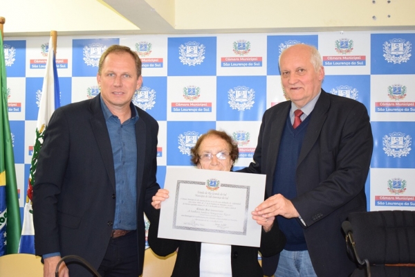 Santina Margarida Rigon recebe o título pelos relevantes e inestimáveis serviços prestados à coletividade deste Município. A Sessão Solene contou com a participação da comunidade escolar, autoridades e a comunidade lourenciana.