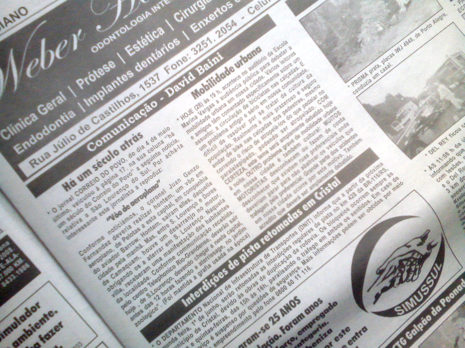 Conforme noticiámos, o coronel Juan Ganzo Fernandez deveria realizar hontem, um vôo em aeroplano, de Pelotas a esta capital, em companhia do aviador Barrow. Hontem, sairam elles, daquella cidade pela manhã. Mas, entre S. Lourenço e Dores de Camaquam, houve um desarranjo no motor, obrigando os a aterrar em S. Lourenço. Naquela villa, receberam uma manifestação dos habitantes da localidade. Conforme communicação recebida, pelo centro Telephonico Rio-Grandense, deverão sair hoje , de S.Lourenço, devendo chegar a nesta capital, antes das 12 horas fazendo a aterrissage, no jardim zoologico”. (Foi mantida a grafia usada na época)