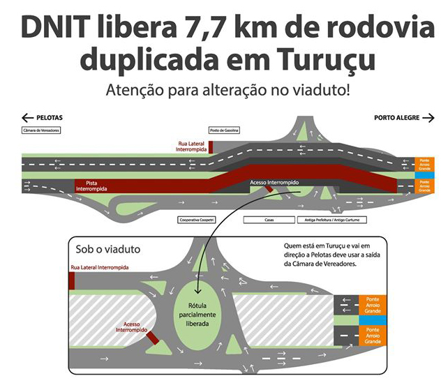 Nesta sexta-feira (13) acontece a liberação de 7,7km de duplicação da BR 116 em Turuçu, (nas proximidades do controlador de velocidade instalado na entrada da cidade até a ponte do Passo das Pedras), incluindo o novo trevo de acesso ao município. A cerimônia de inauguração do trecho vai contar com a presença do Ministro da Infraestrutura, Tarcísio Freitas, e está marcada para as 14h30min.
