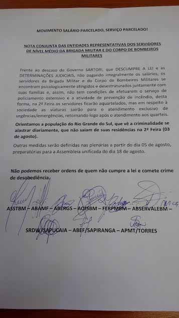 Associações que representam servidores da Brigada Militar estão orientando os PMs a não saírem as ruas para o policiamento ostensivo na próxima segunda-feira, dia 3 de agosto. Em documento assinado por algumas entidades, ficou definido que os PMs de plantão e de folga ficarão dentro dos quartéis, e só sairão para a rua em casos de “urgência”.