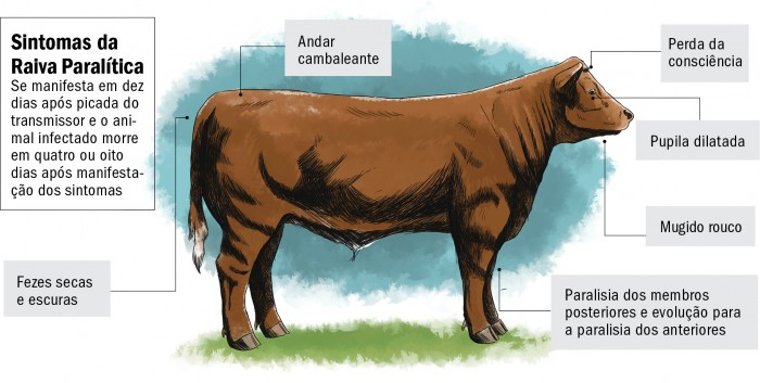 Nos bovinos a forma clínica mais comum é a raiva paralítica, entretanto, podem ocorrer casos de raiva furiosa. Nos casos de suspeita clínica de raiva, não se deve matar o animal, e sim aguardar a evolução natural do quadro e colher material após a morte. Somente o exame laboratorial pode definir o diagnóstico. No Brasil, estima-se que a raiva seja responsável pela morte de cerca de 50 mil bovinos por ano.