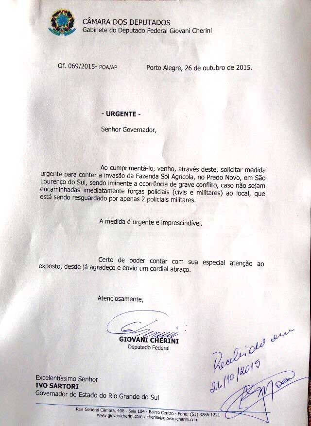 * Parlamentar está preocupado com situação da fazenda invadida pelo MST. Em reunião com o governador José Ivo Sartori na tarde da última segunda-feira (26), no Palácio Piratini, em Porto Alegre, o coordenador da Bancada Gaúcha no Congresso Nacional, deputado Giovani Cherini (PDT), solicitou medida urgente para conter a invasão da Fazenda Sol Agrícola, em São Lourenço do Sul. Segundo Giovani Cherini, a segurança do local se torna evidente e com possibilidade de conflito caso não sejam encaminhadas forças policias (civis e militares), uma vez que apenas dois homens fazem o acompanhamento da situação. Na semana passada, integrantes do Movimento dos Trabalhadores Rurais Sem Terra (MST) invadiram uma área de 750 hectares, na localidade de Prado Novo. São 400 famílias que ficaram no local vindas de acampamentos de Encruzilhada do Sul, Tapes, Eldorado do Sul, Pelotas e Candiota. (Divulgação Dep. Giovani Cherini)