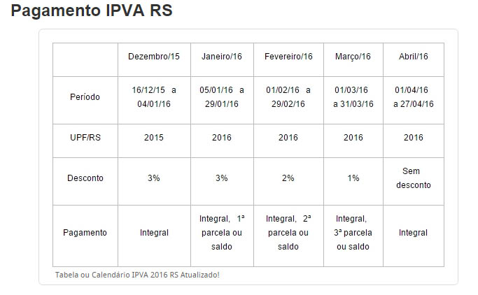 Você poderá pagar IPVA 2016 RS antecipado em até três parcelas, com desconto de 3% na primeira parcela, 2% na segunda, e 1% na terceira. Porém o cálculo será feito com base na UPF 2015. A partir de abril, o pagamento do IPVA RS deve ser integral e não terá desconto. Para poder pagar o imposto parcelado é obrigatório o pagamento da 1ª parcela em janeiro.