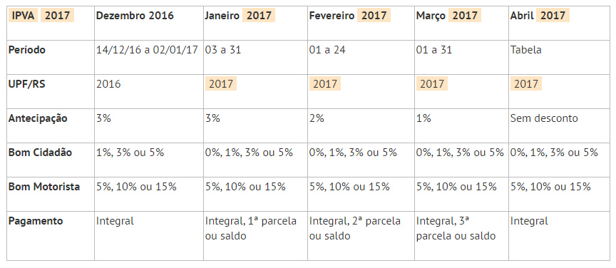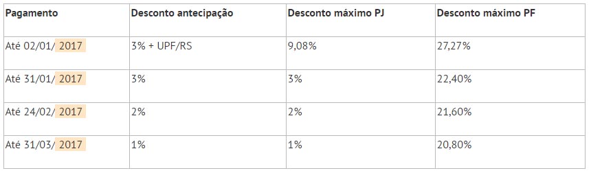 O pagamento integral antecipado do IPVA com desconto de 3%, e sem a atualização da UPF, poderá ser feito somente até 2 de janeiro de 2017.