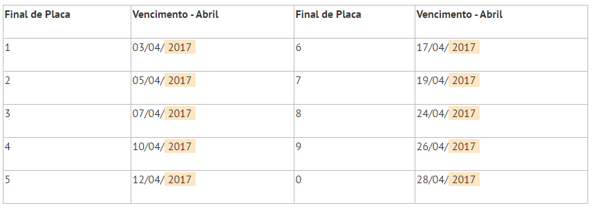 Assim como neste ano, o calendário de pagamento conforme o final da placa dos veículos em 2017 também está limitado ao mês de abril, com a seguinte ordem: