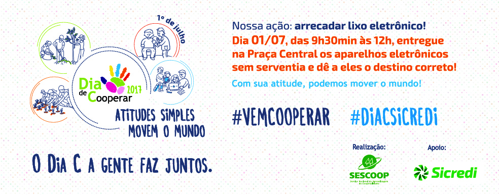 A unidade local do SICREDI estará recebendo LIXO ELETRÔNICO neste SÁBADO, 01 de julho de 2017 na Praça Central Dedé Serpa, das 09:30 hrs até 12:00 hrs.