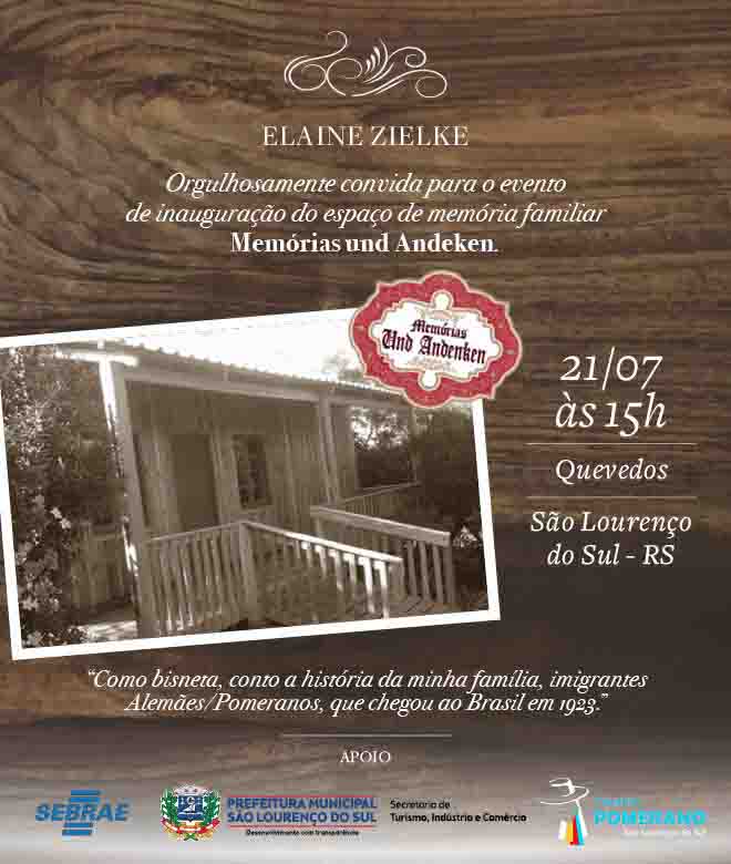 Essa história, que revela as origens de uma parte dos gaúchos e dos brasileiros, será contada em um novo espaço a partir da próxima sexta-feira, 21 de julho, às 15h. A inauguração do “Memórias und Andenken”, em Quevedos (6º distrito), no interior de São Lourenço do Sul, abre mais um capítulo e um novo atrativo no Caminho Pomerano.