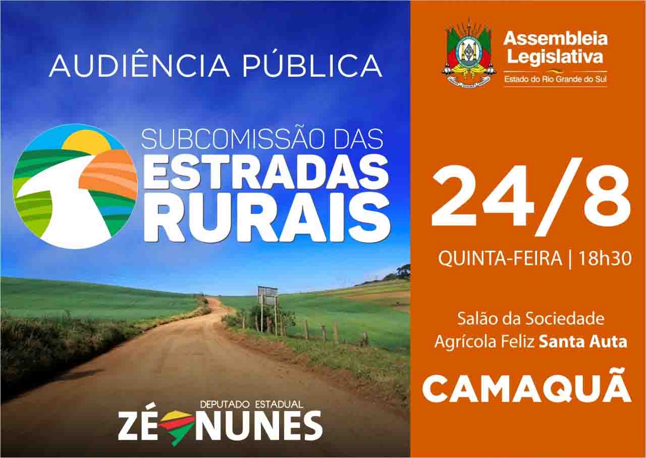 A Subcomissão das Estradas Rurais da Assembleia Legislativa está realizando reuniões de trabalho para estruturar informações técnicas inexistentes no estado sobre a importância das estradas rurais para municípios e para o conjunto do RS. Na próxima quinta-feira (24), às 18h30, será realizada a segunda audiência pública microrregional, no Salão da Comunidade Agrícola Feliz Santa Auta, em Camaquã, abrangendo também os municípios de Cristal, Chuvisca, Amaral Ferrador, Dom Feliciano, Cerro Grande do Sul, Arambaré, Tapes. A primeira audiência foi em Mostardas, no dia 10 de agosto. O objetivo é tomar conhecimento da situação das vias a fim de elaborar um diagnóstico e propor encaminhamentos.