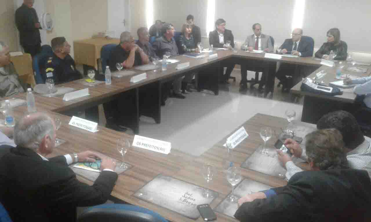 Prefeito Rudinei Härter participou nesta sexta-feira (17) de reunião na Azonasul com o secretário da Segurança Pública, Cezar Schirmer. Na ocasião, Cezar apresentou, aos 23 prefeitos da Associação dos Municípios da Zona Sul (Azonasul) um diagnóstico do cenário atual da segurança pública no Brasil e Rio Grande do Sul e as ações da SSP no combate à criminalidade. O encontro, realizado em Pelotas, na sede da entidade, contou com participações de representantes da iniciativa privada e de órgãos ligados à segurança, como Guarda Municipal, Polícia Civil e Brigada Militar.