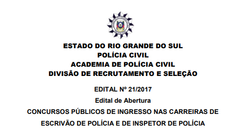 * São 1.200 vagas, sendo 600 para escrivão, com 444 vagas no acesso universal, 60 reservadas à candidatos com deficiência e 96 reservadas à candidatos negros e pardos. As outras 600 vagas são para o cargo de inspetor, também com 444 vagas no acesso universal, 60 reservadas à candidatos com deficiência e 96 reservadas à candidatos negros e pardos. As inscrições para o concurso vão até 19 de janeiro. A aplicação da prova de capacitação intelectual está prevista para o dia 25 de fevereiro. A taxa de inscrição é de R$ 182,41. Para se candidatar, é preciso ser brasileiro, ter no mínimo 18 anos de idade, possuir carteira de identidade, carteira nacional de habilitação (no mínimo categoria B), CPF válido e situação regularizada perante a Secretaria da Receita Federal, estar em dia com as obrigações militares e eleitorais, não ser usuário ou dependente de drogas ilícitas e ter concluído o Ensino Superior em um curso reconhecido pelo Ministério da Educação. Acesse o edital no link: http://acadepol.pc.rs.gov.br/upload/1513773743_Edital_21-2017_Escriv%C3%A3o_e_Inspetor_de_Pol%C3%ADcia.pdf