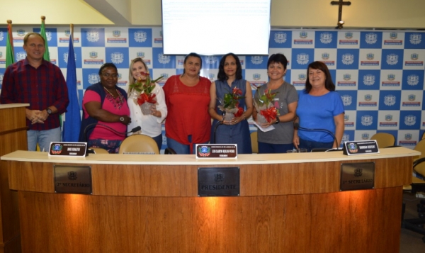 As vereadoras Carmem Rosane Roveré, Marcia Lucas e Fernanda Bork, conduziram os trabalhos na sessão especial, que contou com a participação das seguintes professoras: