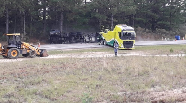 Após a retirada de caminhão acidentado no km 488 BR 392 em Turuçu, trânsito volta a fluir em ambos sentidos, porém com velocidade reduzida.