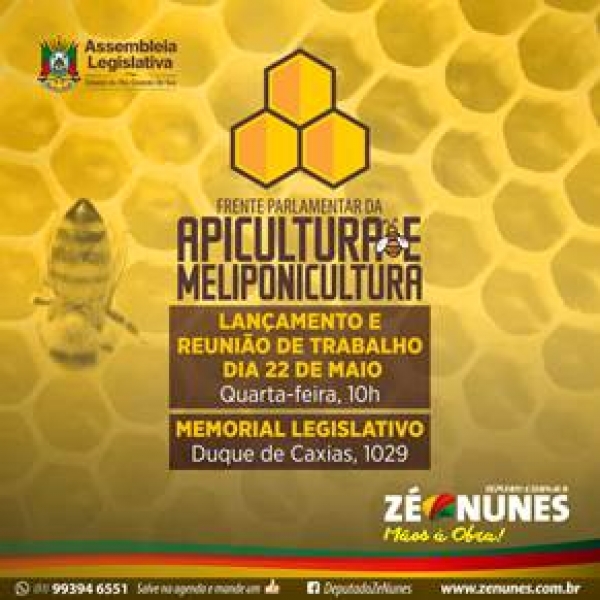 Na quarta-feira (22), dia do Apicultor, o deputado estadual Zé Nunes (PT), fará o lançamento da Frente Parlamentar da Apicultura e Meliponicultura da Assembleia Legislativa. O evento será às 10h, no Memorial da Assembleia, na rua Duque de Caxias, 1029, seguido de reunião de trabalho.