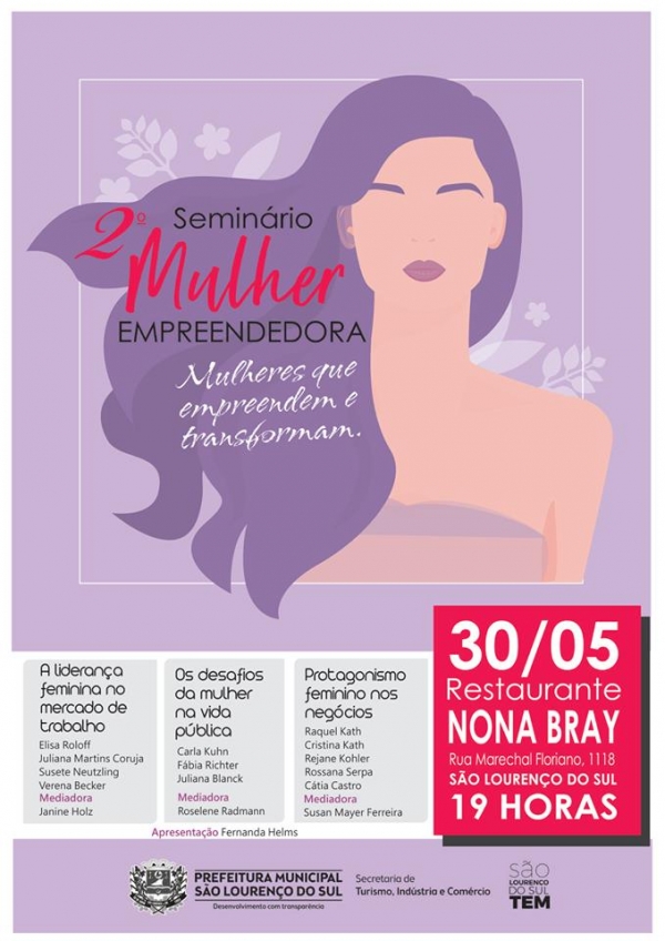 A Secretaria de Turismo, Indústria e Comércio realiza nesta quinta-feira (30), o 2º Seminário Mulher Empreendedora. O evento inicia às 19h no restaurante Nona Bray. O sucesso no ano passado repercutiu nas inscrições para esta segunda edição, que estão esgotadas desde 28 de maio, pois a capacidade de público já foi atingida. A Secretaria reforça que o horário de início será impreterivelmente mantido para às 19h a fim de que a programação planejada seja cumprida dentro do planejado para que o jantar de confraternização ao final não atrase.