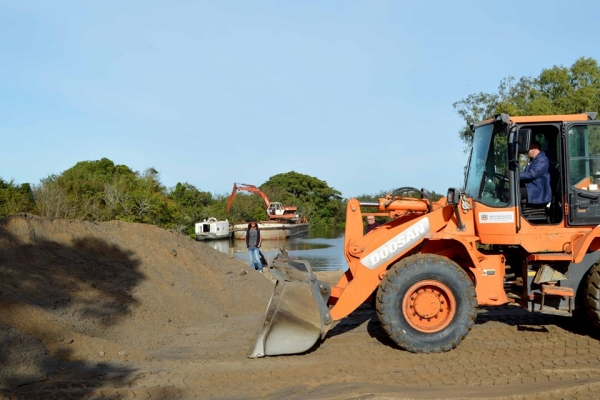 A Draga segue trabalhando nas margens do arroio São Lourenço. Esta é apenas uma parte da areia retirada diariamente do arroio pela draga e que é utilizada em obras de pavimentação dos programas Rua Mais Segura e Pró Transporte, entre outras. É o arroio sendo desassoreado e as ruas recebendo pavimentação.